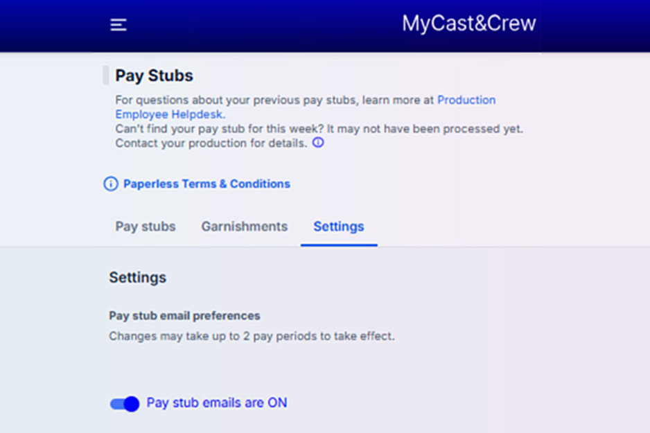 MyCast&Crew: Crew members gain quicker access to earnings with opt-in email notifications that alert them as soon as new pay stubs are available, improving record-keeping and reducing delays in reviewing payment details (Learn more)